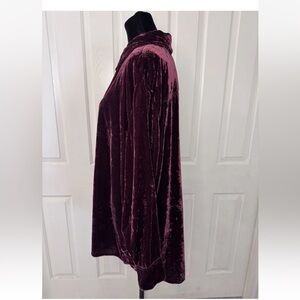 This Lane Bryant velvet blouse in size 16 features a solid red cranberry color with a button-down closure and a collared neckline. The top has extra buttons at the bust, giving it a practical touch. The relaxed fit and tunic style make it suitable for various occasions such as travel, parties, work, or casual wear. The blouse has a gothic royalty vibe, perfect for those who appreciate a whimsical, grunge, or classic aesthetic.