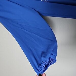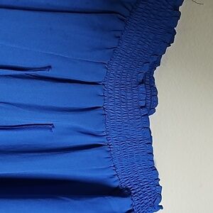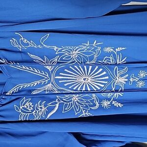 Royal blue color with silver embroidery. Banded smocked bottom. Sleeves has elastic at the end of the sleeves. Has strings that can be worn tied or untied at the neck. Cute shiny embellishments on the design on front. 3/4 length sleeves. Moderately sheer. Spring, summer, boho, statement, office, casual, brunch, workplace, event, weekend, gathering, bling, park, picnic