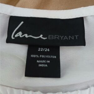 This relaxed white blouse from Lane Bryant features a stylish tie front and a unique bib collar. The cap sleeves and boxy fit make it a versatile addition to any wardrobe, perfect for a casual yet chic look.
