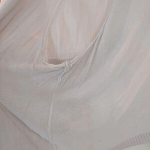 Due to washing the cardigan isn't as white as it was brand new. Some discoloration under armpits.