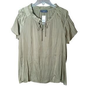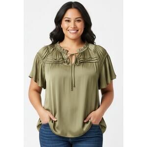 Lane Bryant, Women 18/20 2x, Olive Green-- Round Neck with Tie Closure with Ruffle Accent, Flutter Short, Peasant Style, Lightweight Material (Satin- like material in front, Knit Stretch material in back), Blouse