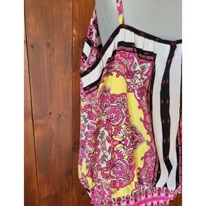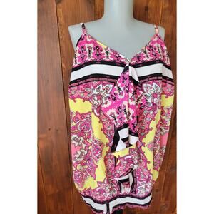 LANE BRYANT Women's Size 26/28 🌺 Vibrant & colorful floral shell top with a silky satin-like feel! Adjustable spaghetti straps ✨ and an elastic waistband ensure a flattering, comfortable fit. Gorgeous pink florals with pops of yellow, black & white 💛🖤🤍 make this a perfect statement piece for warm weather. Flowy ruffle accent down the chest for extra feminine charm.