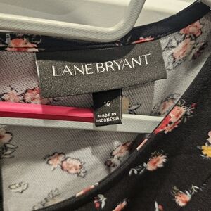 Chic and versatile Lane Bryant blouse featuring a black base with multicolor floral print and a flattering tie waist design. Made with stretch fabric for comfort and easy fit.