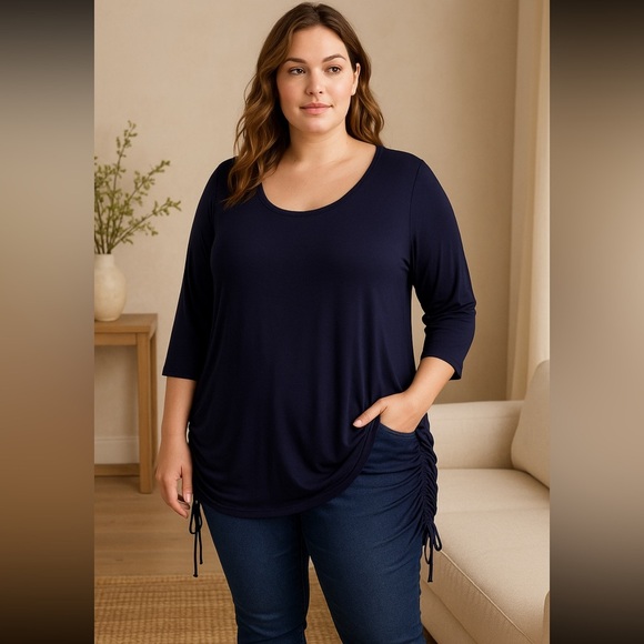 Lane Bryant Women’s 26/28 Navy Blue Tunic Top 3/4 Sleeve Ruched Sides Spandex