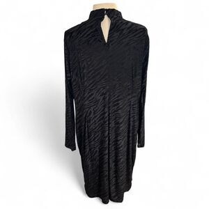 Step out in style with this Lane Bryant black long sleeve dress, featuring a striking tonal zebra print pattern. The design is created with a subtle sheen that catches the light, adding dimension and sophistication while keeping the look sleek and versatile. Perfect for evening wear, cocktail parties, or holiday events.
