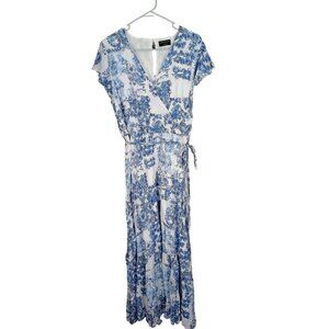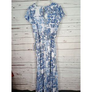Elevate your style with this stunning blue floral maxi dress. Featuring cap flutter sleeves and a surplice neckline, it offers a flattering fit. The tiered design adds movement, perfect for any occasion.