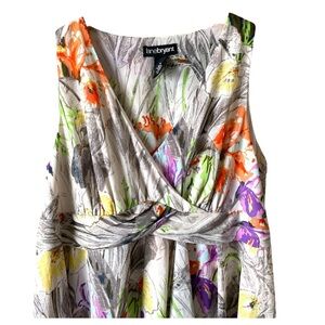 This sleeveless sundress by Lane Bryant features a chic asymmetrical design with a flattering V-neckline and a ruched wrap-style bodice. The vibrant orange and green hues make it perfect for resort wear, while the light, airy fabric ensures comfort and style.