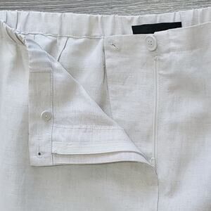 Tan colored linen blend capri. Elastic waistband. Zipper button closure. Lightweight. Not lined.
