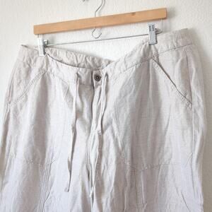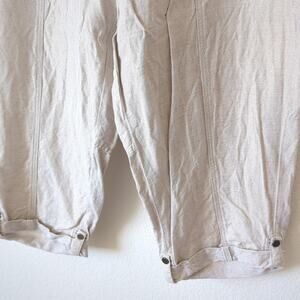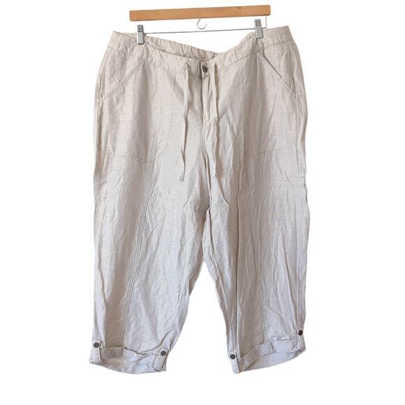 Lane Bryant women's plus size pants size 18-20 55% linen 45% rayon drawstring waistband cropped cuffed pants beige with gold glittery threads casual beachy inseam 22.5 rise 13 flat across waistband 20" In excellent pre-owned condition perfect summer travel pants