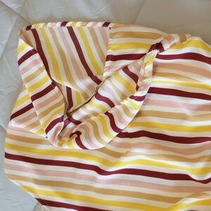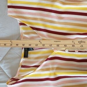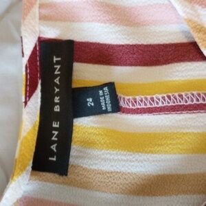 This is a Lane Bryant women's short sleeve V-Neck Smock Waist top in a size 24. It is a peplum style with tan, yellow, and red stripes. It buttons up part way and has flutter sleeves. It is perfect for spring or summer.