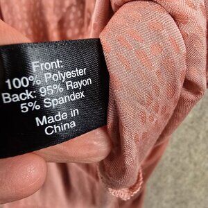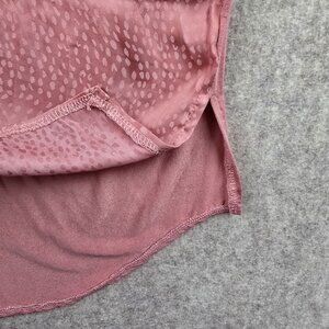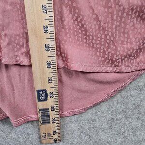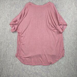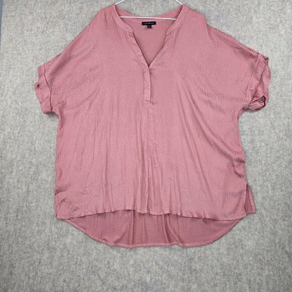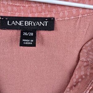 Pre-owned Lane Bryant women's plus-size blouse in a textured pink fabric. Features short sleeves, button-front neckline, and lightweight material with a high-low hem.