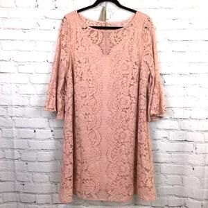 Lane Bryant Women's Romantic Feminine Lace Boat Neck Flounce Bell 3/4 Sleeve Lined Pink Knee Length Dress 14P