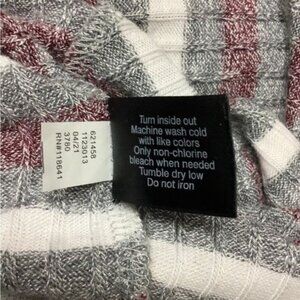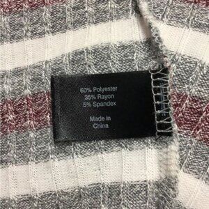The Lane Bryant Women's Short Sleeve V Neck Stripe Sweater Tunic in size 22/24 is a casual, gray and white knit top, made from a comfortable polyester, rayon, and spandex blend.