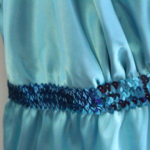 This short camisole blouse is light turquoise. The fabric is silky with a slight sheen. It has a wrap front with adjustable straps. It has an empire waist with rows of metallic turquoise sequins under the bust line. The back has elastic smocking.