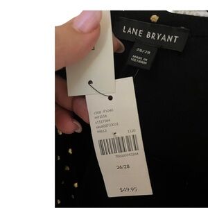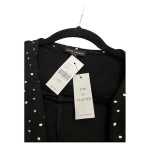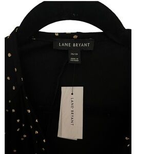 Lane Bryant women's tunic in black and gold polka dot print. V-neck. Size 26/28. Made of polyester.