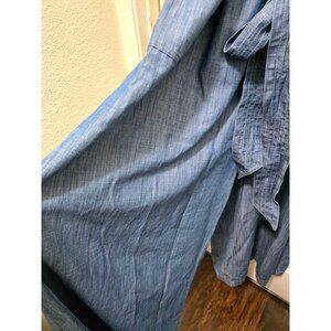 Stylish chambray sleeveless midi dress designed for comfort and elegance. Features a flattering tie waist and functional pockets for practicality.