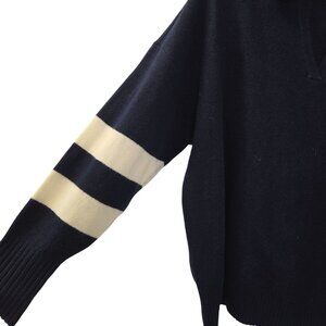 Really nice, collared wool blend sweater with a v-neck design and striping on the sleeves.