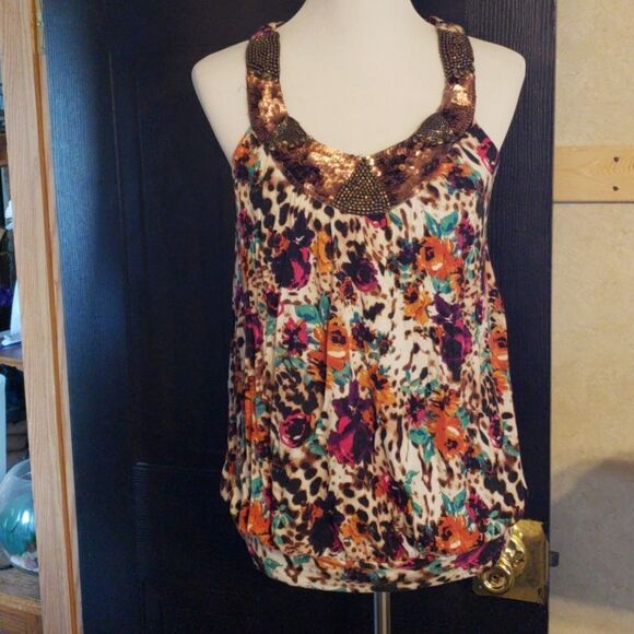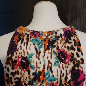 Lane Bryant multi color abstract print tank with sequin details around halter neckline. Wide band at hem line adds now defined waist size 14/16