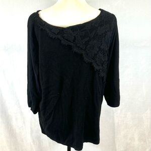 Beautiful lace detail that lined one shoulder on the front and back of this black knit sweater. Euc