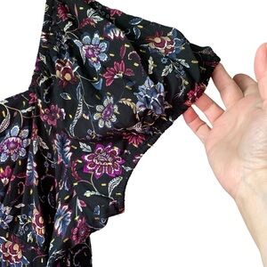 Lane Bryant black milkmaid peasant maxi dress with puff sleeves multi floral print in burgundy, pink, purple, cream and blue. Empire bust with tie and wide ruffle trim at skirt hemline. Lined. Back zipper closure. Splash of gold metallic sparkle throughout! Tags: casual, date night, flattering, flowy, wedding guest, gypsy. Size 22
