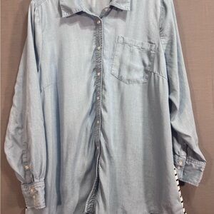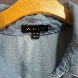 The Lane Bryant chambray collared shirt is a stylish and versatile addition to any woman's wardrobe. Made from comfortable cotton fabric in a solid blue color, this long sleeve shirt features a classic collared neckline and button closure. Perfect for casual occasions in the summer, fall, or spring, this plus-sized shirt offers a regular fit for a flattering and comfortable look. Easy to care for with machine washable instructions, this basic button-up shirt from Lane Bryant is a timeless and practical choice for everyday wear.