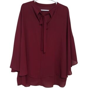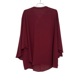 This Lane Bryant top is a stylish and versatile piece. It is a deep burgundy color, with a flowy, cape-like design. The top has a v-neckline and wide, batwing-style sleeves that add a touch of elegance. It features a tie in the back. The material is lightweight and slightly sheer, making it perfect for layering or wearing on warmer days. The top has a relaxed fit, making it comfortable and easy to wear. It would be a great addition to any wardrobe, suitable for both casual and dressier