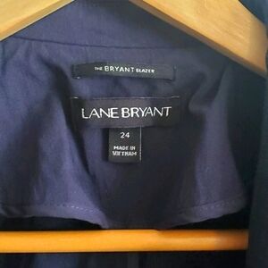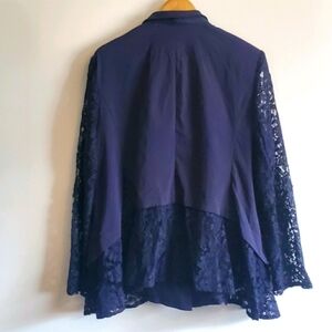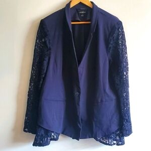 Lane Bryant navy blazer with lace sleeves and back hem. One button closure. Thin shoulder pads. Faux pockets.