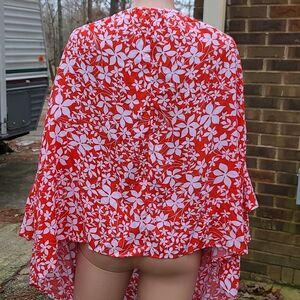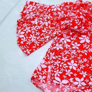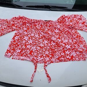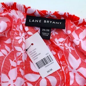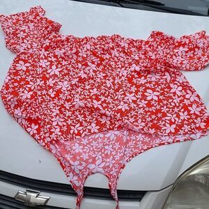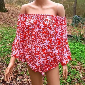 Adorable orange floral Hawaiian print off the shoulder blouse featuring short bell sleeves, elastic neckline, slits on the sides, a short tie in front, size 26/28, brand new with tags from Lane Bryant.
