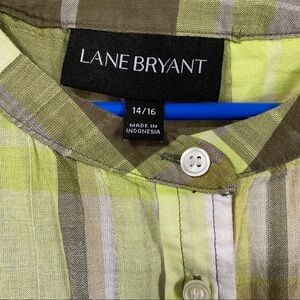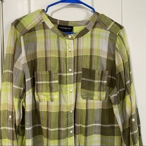 Lane Bryant plaid button down top with long sleeves. Can roll and button for 3/4 sleeves. Collar neckline. Great colors of olive/army greens, yellows and whites. Size 14/16.Approximate measurements pit to pit 24” length 19”. 100% cotton. - light weight- sheer side. Excellent condition