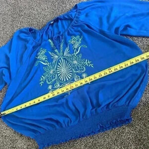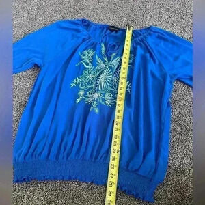 Description: Beautiful blue women’s blouse with stretch edging on bottom, very flattering. Tie on the collar three-quarter length sleeve. 100% polyester, lightweight and comfortable. Perfect for the office or casual outing!