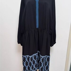Stylish black dress featuring a blue geometric pattern. Perfect for any occasion.