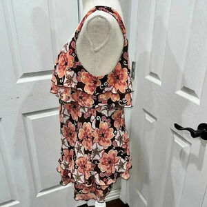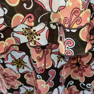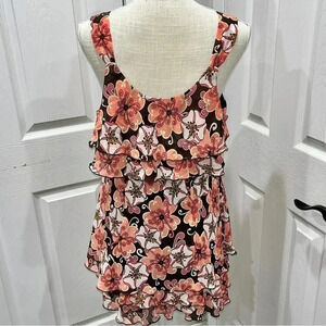 Description: Sleeveless blouse with tiered ruffles. Lined, pullover, flattering, floral. Darling for Work or Casual, wear