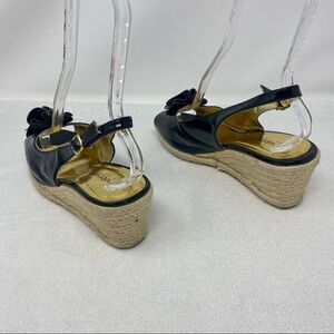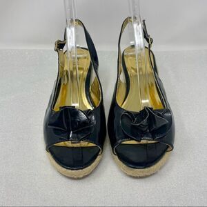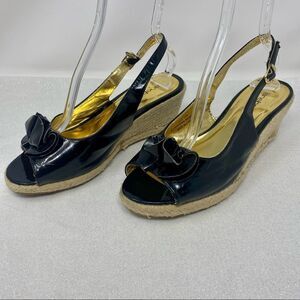 Black gloss black wedges from Lane Bryant in size 10 Wide. They had an adjustable buckle slingback ankle strap and bow across the toe. There is some wear on the cord wedge but the uppers are in good condition.