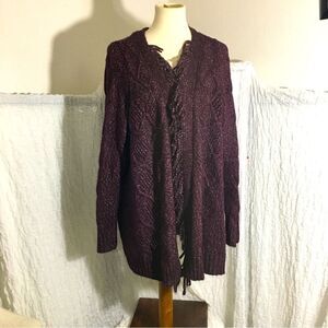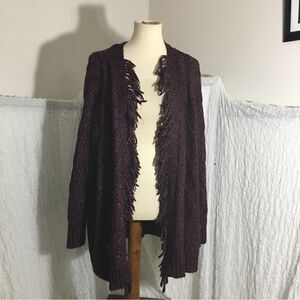 Plum color chunky knit open cardigan sweater with fringe details. Pre-owned in good condition. Please refer to pictures for best description and condition verification.