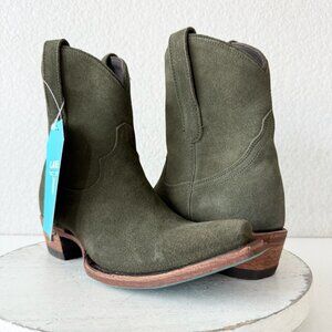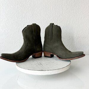 Lane EMMA JANE Womens Cowboy Bootie in Olive Green Suede Leather with a Western Pointed Snip Toe and Short Ankle Shaft