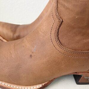 Condition: These are new boots. The leather is designed to develop a distressed appearance. There are some lines in the leather and some turquoise paint on the right front sole - please see close up pics. They will come with a boot box and fit true to size.