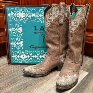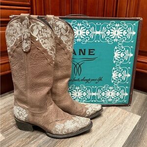 Preloved authentic Lane Jeni Lace Cowboy boots. Brown colored boots featuring lace detail. Size 7. Preowned, but still in great condition! Perfect wedding boots!