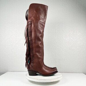 NEW Lane Katori Over the Knee Womens Cowboy Boots in Deep Brandy Brown Leather with a Western Pointed Toe, Zipper closure and Removable Fringe.
