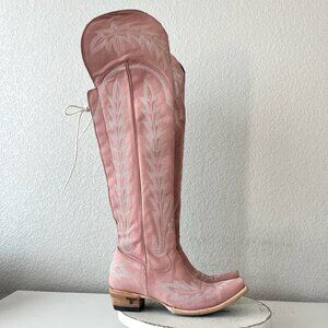 Lane LEXINGTON Over The Knee Womens Cowboy Boots in Blush Pink leather with a Western Snip Toe and Adjustable Corset that is Wide calf friendly.