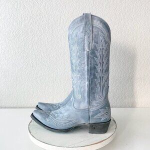 Lane LEXINGTON Womens Cowboy Boots in Washed Denim Blue Leather with a Western Pointed Snip Toe and 13" Tall Mid Calf Shaft