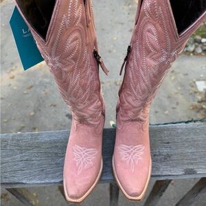 Stylish pink western boots with intricate stitching. Perfect for a chic country look. Zipper sides. Worn in the driveway while trying them on and scuffed the bottoms 😭. Otherwise brand new.