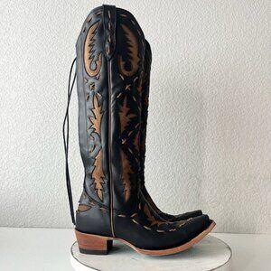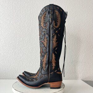 Lane Reverie Knee High Womens Cowboy Boots in Jet Black and Burnt Caramel Brown Leather Inlay featuring a corset closure in the back.