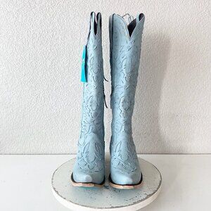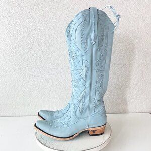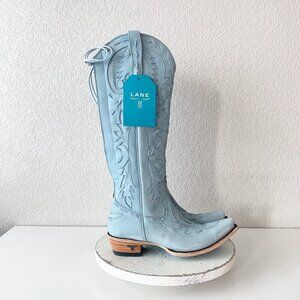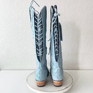 Lane x West Desperado Reverie Knee High Womens Cowboy Boots in Powder Blue Suede Leather featuring a corset closure in the back that extends for wide calf. They also have a Western Pointed Snip Toe. The leather is super soft!