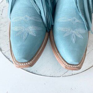 Lane Senita Falls Women's Fringe Cowboy Bootie in Powder Blue Suede leather with a Western Pointed Snip-toe and Short Ankle Shaft.