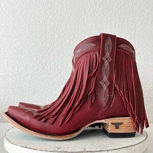 Lane Senita Falls Women's Fringe Cowboy Bootie in Smoldering Ruby Red leather with a Western snip-toe and Short Ankle Shaft.