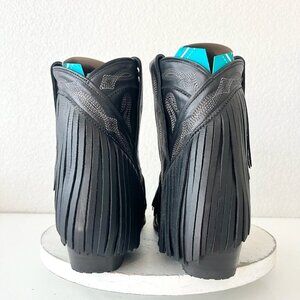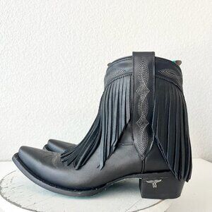 Lane Senita Falls Women's Fringe Cowboy Bootie in Jet Black leather with a Western snip-toe and Short Ankle Shaft.