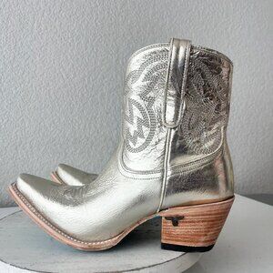 Lane Boots SMOKESHOW Womens Cowboy Bootie in Champagne Metallic Gold Leather with a Western Snip Toe and Zipper Ankle Closure.