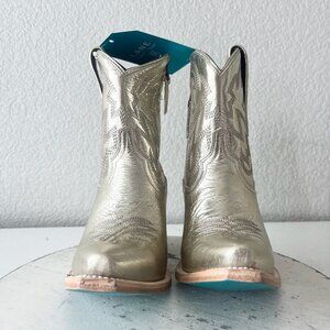 Lane Boots SMOKESHOW Womens Cowboy Bootie in Champagne Metallic Gold Leather with a Western Snip Toe and Zipper Ankle Closure.