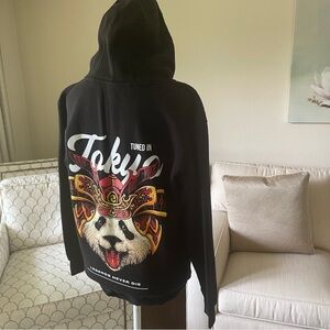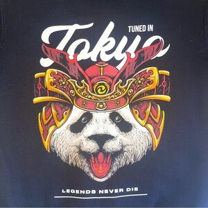 Lane Seven Tuned In Tokyo panda hoodie sweatshirt. Black hoodie with drawstring and kangaroo pocket. ribbed cuffs and waistband. Back features silk screen panda with colorful headpiece, Legends Never Die. 80% cotton 20% polyester. Approximate measurements laying flat: the chest is 21” and the length is 25”. Unisex. New without tags. Size M