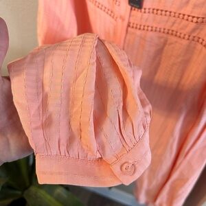 Crew neck. 3/4 sleeves with single-button cuffs. Button front. Side slits at hem. Bust darts provide shape for the perfect fit. Woven dobby fabric. Slightly longer length.
